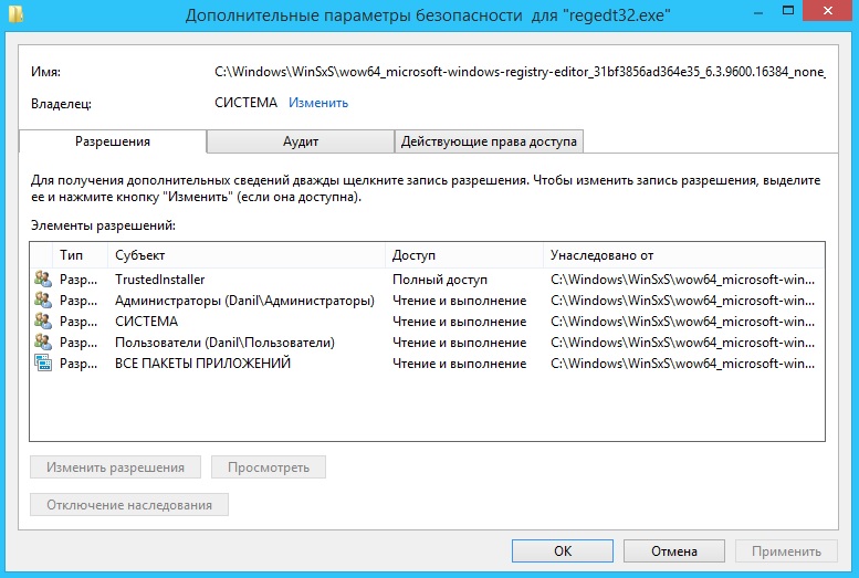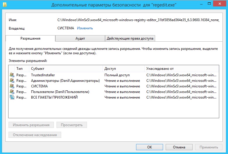 При подключенном интернете, в командной строке, от имени Администратора выполните: Процесс займет некоторое время, необходимо дождаться завершения. Отчитайтесь о результате. Сделайте скриншоты разрешений на файлы C:\Windows\WinSxS\wow64_microsoft-windows-registry-editor_31bf3856ad364e35_6.3.9600.16384_none_ef41bfc1e4306f06\regedit.exe C:\Windows\WinSxS\wow64_microsoft-windows-registry-editor_31bf3856ad364e35_6.3.9600.16384_none_ef41bfc1e4306f06\regedt32.exe ПКМ на файлах > Свойства > Безопасность > Дополнительно - вкладка Разрешения. |