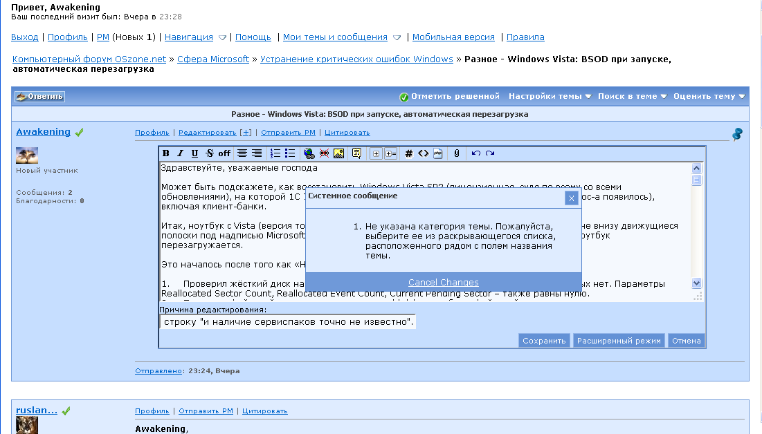 Профиль | Отправить PM | Цитировать Прошу прощения, что приходится множить сообщения, но при попытке отредактировать отправленное сообщение, я вижу "Не указана категория темы". Скриншот прилагается. Подскажите, пожалуйста, где указать категорию темы, и я непременно её укажу.