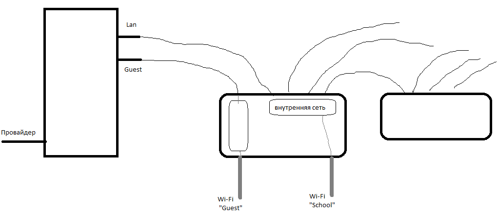 от 2-й сетевой в свитч от 3-й сетевой в роутер (в принципе он поддерживает vLan, это дальнейшая настройка) идеальный вариант, который я представил в голове: на роутере создать второй Wi-Fi b соединить через vLanы к Wan-порту а Lan-порты роутера использовать для внутренней сети |