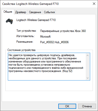 Профиль | Отправить PM | Цитировать Здравствуйте. Установил драйвер на Logitech F710 по инструкции alexsgu, однако после перезагрузки в обычном режиме геймпады недоступны, в свойствах написано "Не удается проверить цифровую подпись драйверов, необходимых для данного устройства". В более ранних версиях Windows 10 после установки драйверов геймпады работали без проблем, позавчера установил Windows 10 Pro 1607 (14393.693) и появилась проблема.
