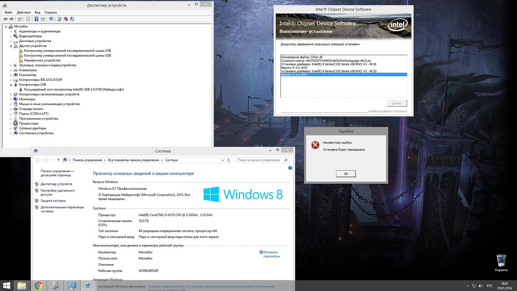 Доброго дня. Столкнулся с такой проблемой: Перестали работать все usb порты. В диспетчере устройств драйвера стали со знаком вопроса. Удалил их и нажал обновить, windows не смогла отыскать ничего. Скачал с офф сайта производителя мат платы драйвера. Но при установке выдает неизвестную ошибку, да и сама установка долго запускается. Порты исправны так как в биосе могу спокойно пользоваться usb мышкой и клавиатурой. Так же по подсветке видно что она сперва загорается и когда начинает грузиться windows тухнет. Прикрепляю скрин ошибки. Мать asrock b85 pro4