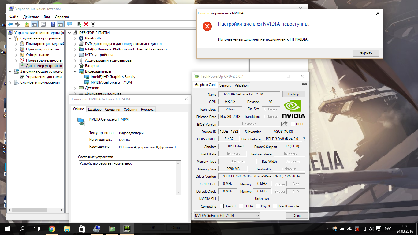 Ноутбук ASUS x550lb. Недавно установил Windows 10, но вот проблема, дискретная видеокарта (в моем случае это nVidia GeForce GT 740) выдавала код ошибки 43 (не сразу, по началу все работало). С этим я вроде разобрался и теперь в диспетчере устройств у меня все нормально и данный код не появляется. Но я заметил, что ноутбук не переключает видеокарту с интегрированной на дискретную. Так же при попытке запустить Панель управления NVIDIA выходит ошибка "Настройки дисплея NVIDIA недоступны. Используемый дисплей не подключен к ГП NVIDIA". В чем может быть проблема? Может ли быть это отвал ГП? Потому что после установки Windows 10 все нормально работало до одного вылета. Все изображение рассыпалось и ноутбук завис, что пришлось его выключить самому и заново включить. Данная проблема с этой моделю ноутбука не у меня одного.