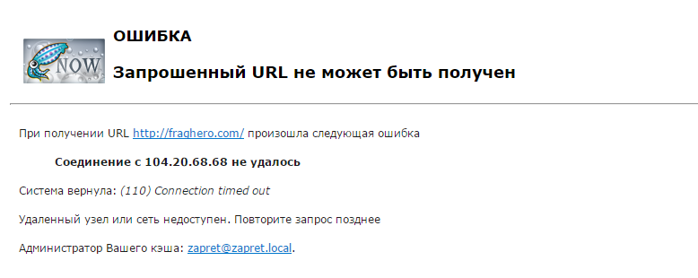 ERROR The requested URL could not be retrieved The following error was encountered while trying to retrieve the URL: http://www.ign.com/ Connection to 188.43.76.56 failed. The system returned: (110) Connection timed out The remote host or network may be down. Please try the request again. Your cache administrator is zapret@zapret.local. Generated Fri, 10 Jun 2016 13:15:19 GMT by zapret _____________________________________________________ ОШИБКА Запрошенный URL не может быть получен При получении URL http://fraghero.com/ произошла следующая ошибка Соединение с 104.20.68.68 не удалось Система вернула: (110) Connection timed out Удаленный узел или сеть недоступен. Повторите запрос позднее Администратор Вашего кэша: zapret@zapret.local. _____________________________________________________ Пинговать пробовал, всё нормально. Меняю IP через расширение в браузере, сайт загружает нормально. Возвращаюсь на свой IP, перестаёт грузить. ОС Windows 8.1 |