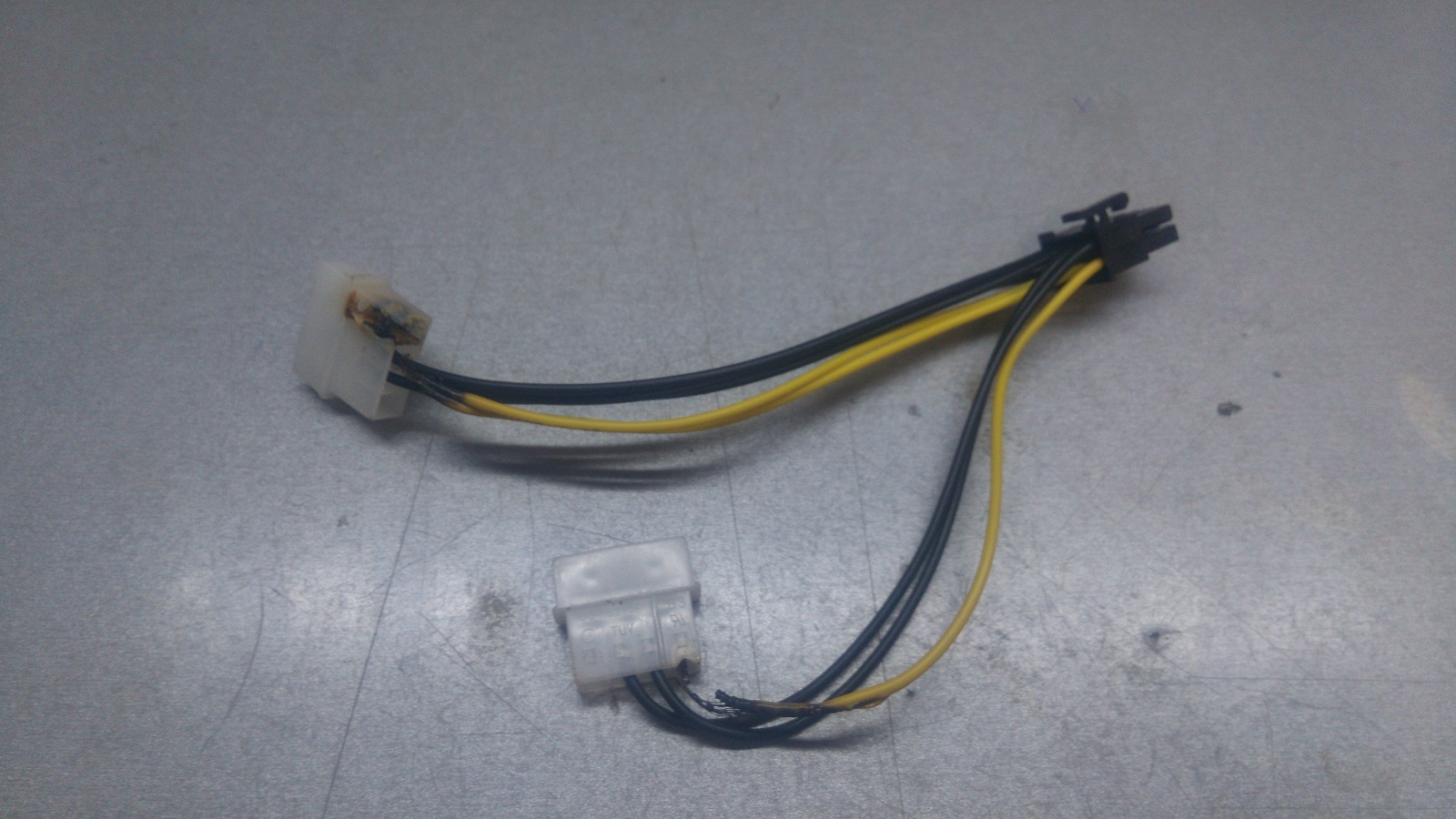 Прикрепляю фото. Впринципе все довольно ясно. Горит переходник 2xMolex -> 8pin PCI-E, на контактах молексов. Оборудование: видюха GTX 770 от гигабайта, БП некий Winard на 700W. Переходник обычный купленый за 300 рублей. У этого БП есть только 1 коннектор на 6pin. У видюхи питание 6+8 Скажу сразу, что это происходит не первый раз. В первый раз было то-же самое, только переходник был самодельный. Подумал, что хреново сделал. Потом был куплен новый, и произошло то-же самое. Логика говорит что он просто не выдерживает напряжения. Инцидент произошел во время запуска игры на максималках, минут через 10 игры. В стандартном режиме ниче не горит. Сразу в гугл, я не первый, у кого такая проблема, но дельного совета не нашел. Менять БП не вариант. Может кто знает переходники лучше, и поделится ссылкой? У меня есть руки, опыт, я бы мог спаять из двух переходников один, дабы распределить нагрузку между большим числом проводов, но не уверен стоит ли, и поможет ли. Но возможно есть еще какой-то вариант переходника, я даже не знаю, как сделать чтоб эта адская машина не горела, при этом не меняя БП? Ах, да, переходник подключен к разным "веткам" проводов на БП |
