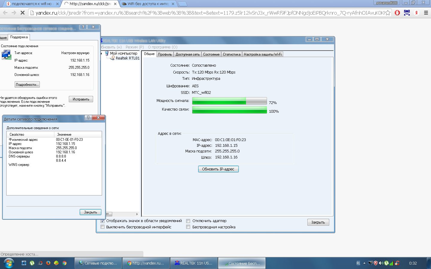я его подключил при помощи ручной настройки сети , потому что при автоматическом получении айпи он перезапускался, вроде в ручном режиме все заработало , желтый треугольник ушел , но интернета все равно нет. ОС у меня ХР открываю хром и пишет что компьютер ваш не в сети.пробовал и другим путем не прогой реалтековскоей а как обычный вай фай от макрософт, но бесполезно перезапускается , т.е подключается и отключается сразу и так бесконечно |