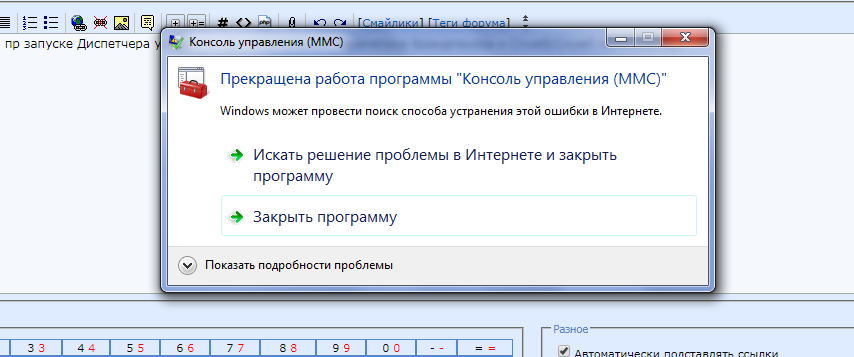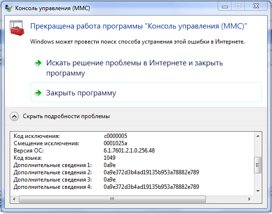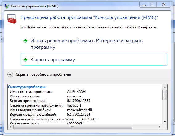 Службы - [решено] Прекращена работа приложения "Консоль управления (MMC)"