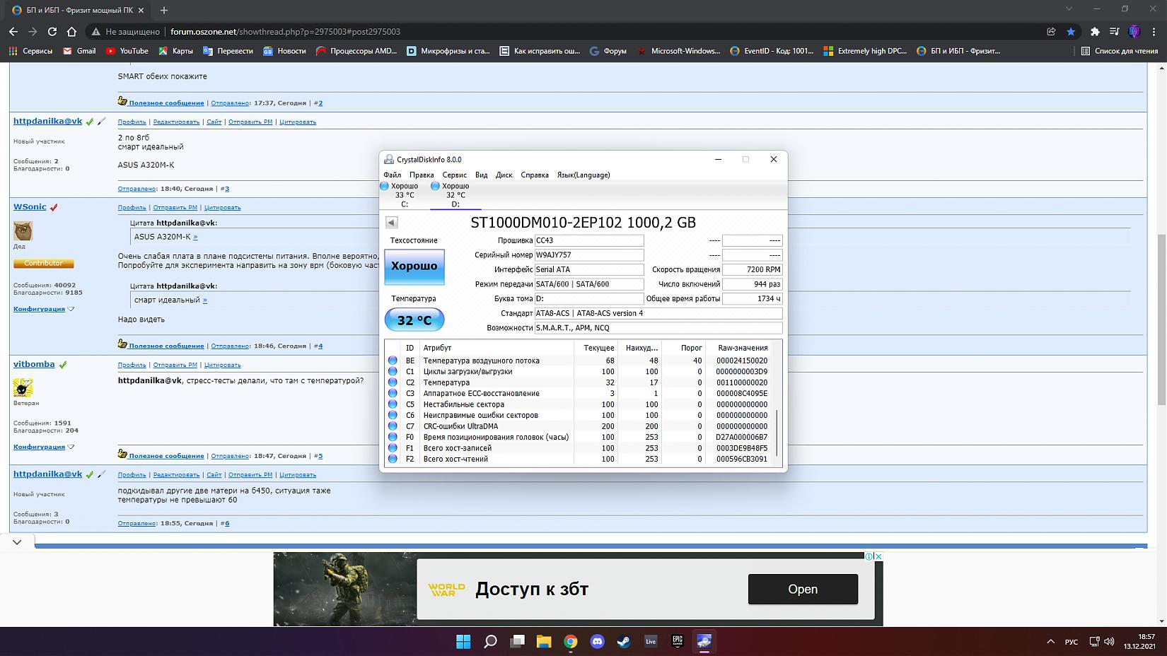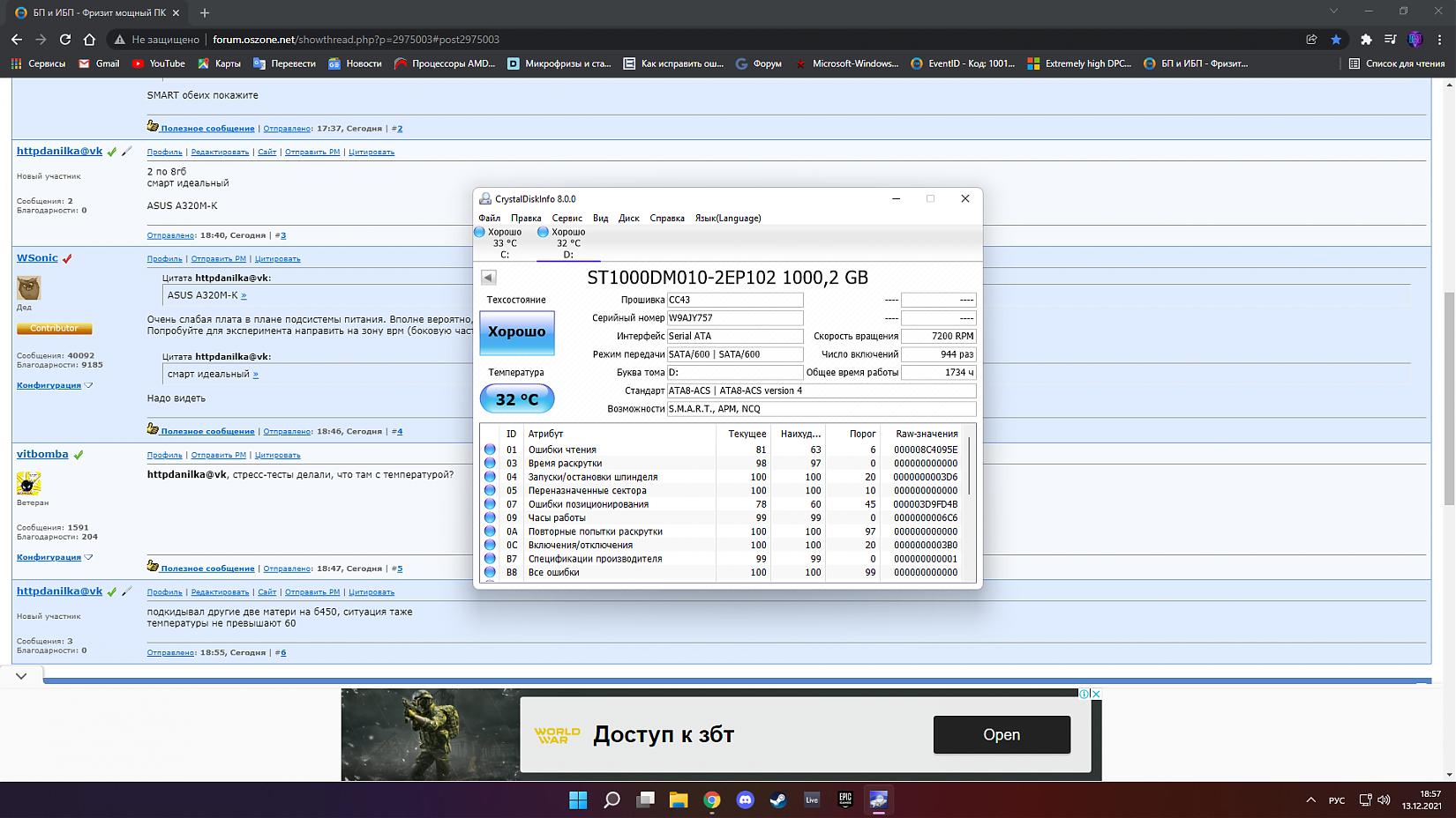Начнём с конфига GTX 1650super R5 2600 16 gb озу 3200мгц БП ste500w 240gb ssd 1tb hdd Проблема заключается в том, что появились фризы во всех играх.Тестил в кс, фортнайт, Хайпер скейп, гта 5. Везде присутсвуют фризы и разрывы картинки(вертикалку пробовал) . В кс они происходят в основном, пока не пробежишь по всей карте и не произойдут все события(открытие меню, хэдшот и тд) А в остальных играх, просто не описать словами, фортнайт -фризы просто всегда и это на МИНИМАЛКАХ на максимальных начинается лютое слайд-шоу (7мес назад всё было норм)Нооо в посторонних бенчмарках и в томб райдере никаких фризов нет(кроме фризов в меню) . Даже в ВОРДЕ фризит картинка, когда ты её поворачиваешь. Если на каком-то сайте вылазит реклама, страница тоже начинает жёстко плавать. При скроле ютуба сильно рвало картинку (но именно этот пункт решился отключением аппаратного ускорения. И вот буквально недавно ПК начал намертво зависать, что даже Дисп задач не помогал. Когда например что-то скидываешь или начинаешь рендр. Делал уже всё возможное, от самого банального до самого невообразимого. Разные версии биоса, драйверов, настройки реестра, биоса, винды, разные ревизии винды (10, 10лтсц, 11) носил в в сц там подкидывали другую видюху, мать, проц, память, диск. Побоку . Я вас умоляю, мучаюсь уже 7 месяцев, если кто-нибудь поможет, могу даже заплатить!!! |