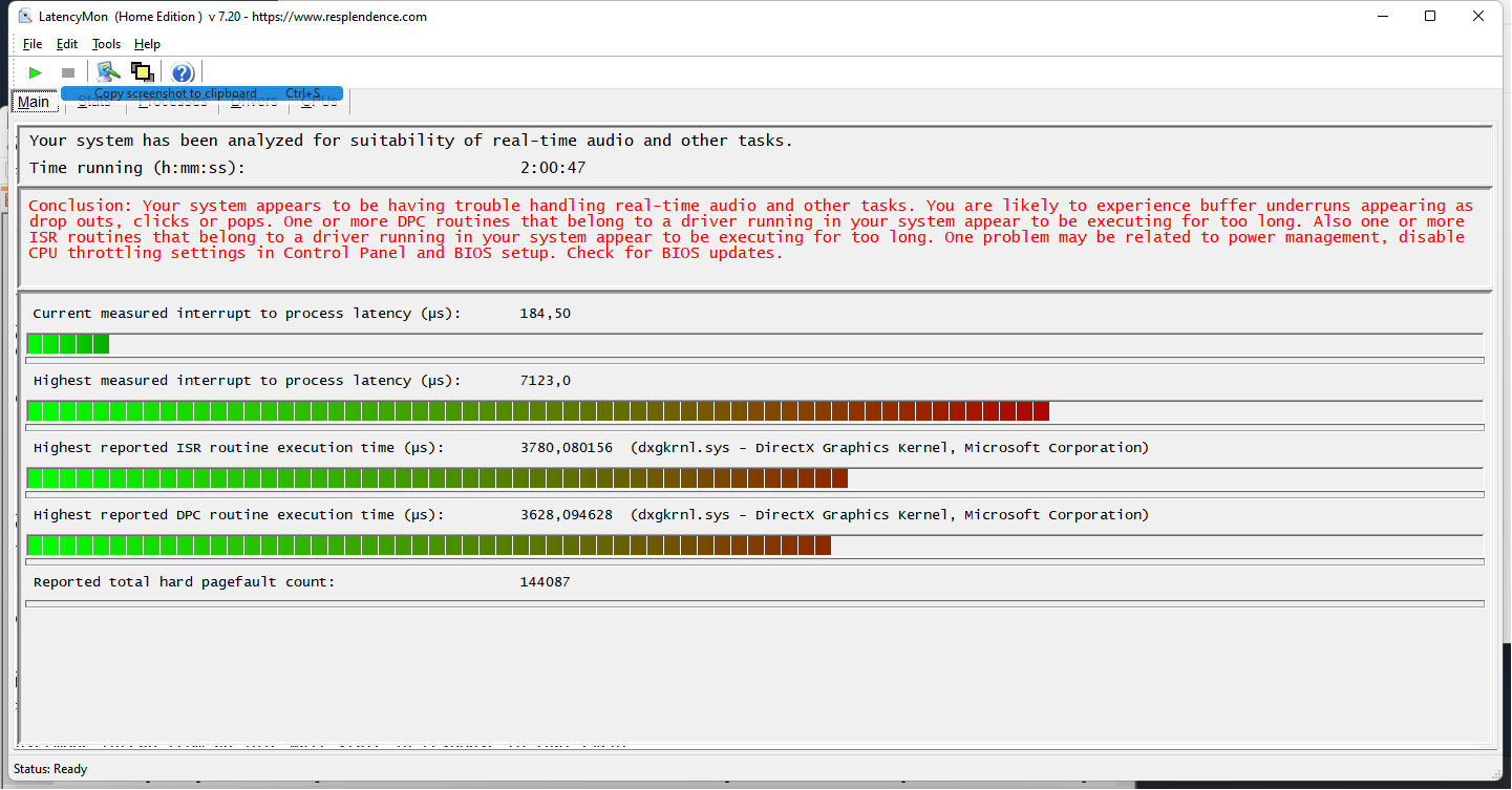 Извините, если не туда запостил, я не знаю проблема вызвана железом или софтом, но думаю, что это наиболее подходящий раздел. Проблема следующая: Происходит фриз картинки и звука: вместо видео слайдшоу, а звук заедает. Длится около 1-2 секунд. Регулярность - довольно редко, в среднем 1-3 раза за день. Условия в которых происходит: в игре либо при просмотре видео в браузере. Возможно, и в другие моменты происходит, просто незаметно из-за статичности картинки и отсутствия звуков. Погуглив похожие темы не нашел какого-то пошагового метода проверки, у каждого виновником оказалось что-то своё - бп, оперативка и тд. Поэтому прошу подсказать оптимальный путь проверки, что и как.. Полезные факты и что уже проверил: Судя по всему дело не в ОС и не в SSD на который установлена система т.к. на днях приобрел новый SSD и установил на него Win11 с нуля (официально с сайта MS, без каких-то модификаций), проблема сохранилась. Никаких разгонов железа нет и не было. В журнале событий ОС ("Просмотр событий") ничего подозрительного не нашел, в разделе "Журналы windows - Система" вообще никаких записей не появляется на то время когда происходит фриз. Менять каждую железку в компе на другую и исключать таким образом возможности нет.. Прикрепил скриншот из latencymon, видел в нескольких похожих темах, что она может определить причины подобных задержек, я не особо понимаю как интерпретировать результаты этой программы, но вроде бы показывает, что всё ок. Актуальный конфиг железа в профиле. |