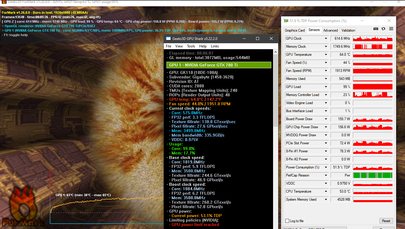 Недавно пк вырубился во время игры, после перезапуска всё начало фризить. Решил проверить в фурмарке, там частоты ядра и памяти скачут от минимальных до максимальных, так же появился power limit на 60%.