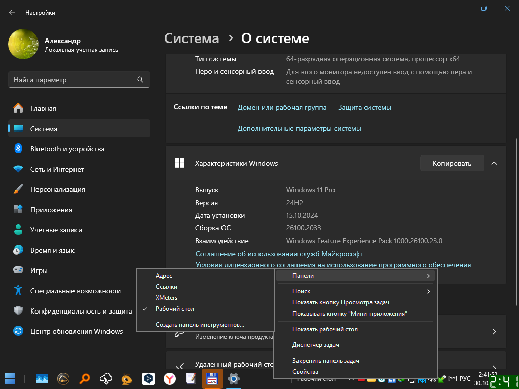 На днях я купил новый компьютер и ввожу его в эксплуатацию начав устанавливать всё начисто. Вот и столкнулся с ситуацией, что невозможно создать Панель инструментов. Но дело в том, что на моём старом компьютере с Windows 11 24H2 эта панель была! И была штатная, а не какая-то внешняя утилита! Сам жёсткий диск от старого компьютера я использую на новом, старый системный раздел удалил, но у меня осталась его резервная копия. Я всегда себе делаю разные страховки и описание настроек. Проблема в том, что ничего про Панель инструментов у меня нет, а как делал не помню. Это было возможно потому, что я в прошлый раз как-то очень быстро решил этот вопрос или просто забыл. Здесь же я прикладываю одну из своих страховок — скриншот Панели задач с Панелью инструментов на Windows 11 24H2. |