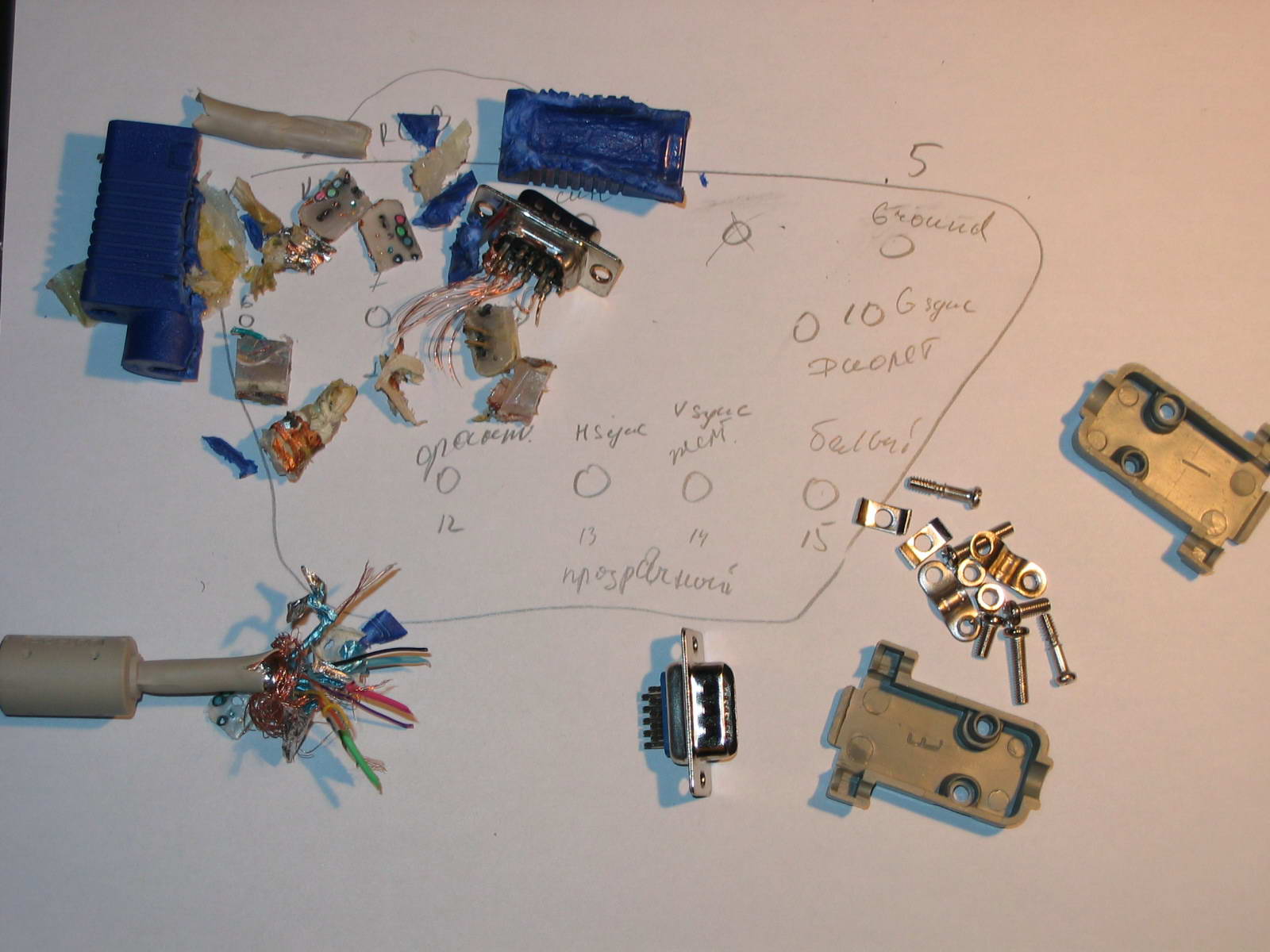 Можно и менее варварским способом обойтись: на отрезке примерно 2 -3 сантиметра снимается изоляция кабеля монитора сразу у литой вилки, отделяется каждый провод, экранированные кабели R, G, B тоже придётся вскрыть. Затем с помощью тестера выяснить искомое - какого цвета провода припаяны к штырькам разъёма D-Sub. Причём обрыв чаще всего и происходит у основания вилки. Если достаточно терпения, эту вилку можно не менять на разборную, а аккуратно вычистив лишнее изнутри, запаять и вернуть всё к первоначальному состоянию. Только длина кабеля монитора уменьшается на несколько сантиметров.