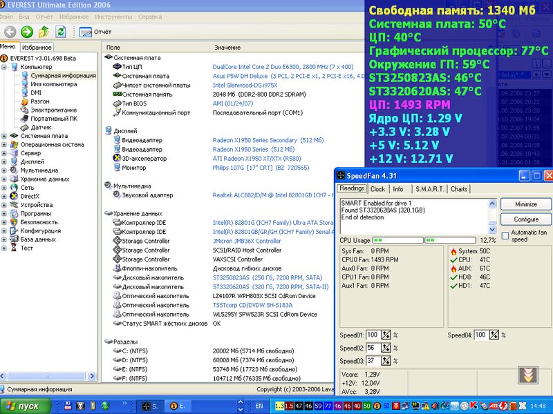Asus P5W DH Deluxe Intel Core 2 Duo E6300 (номинал 1.86) 2х1024 Patriot 6400 Radeon X1950XTX Начитавшись различных статей, решил немного разогнать ПК. Дело в том, что мама по дефолту выставила память на 5300. Это то меня не устроило. Поэтому скачал новый BIOS 1901 (ранее 1506), перепрошил. В новом биосе выстовил FSB на 400 (по умолчанию 266) и память на DDR-800. После чего проц заработал на 2.80Ггц, память на своих 800 (соотношение 1:1). Но пугает меня то, что различные программы показывают температуру AUX от 60 и выше (температура чипсета и видюхи не беспокоят... все в норме). Есть предположение, что aux тоже самое, что и окружение гп (по соотношению температур). Расталкуйте мне, чайнику, что такое AUX, и как его температуру можно понизить? |