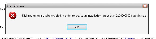 Профиль | Сайт | Отправить PM | Цитировать Это значит, что размер, максимальный размер исполнимого файла Inno Setup Может создать не больше чем - 2100000000 то есть не больше 2,1 Ггбайта, а больше даже Windows не поймёт, скажет, что исполнимый файл не может быть, больше, какого-то размера, 2,1 гбайта. Нужно разбить компилируемый файл на части по 21000000000, или меньше, создадутся файлы: