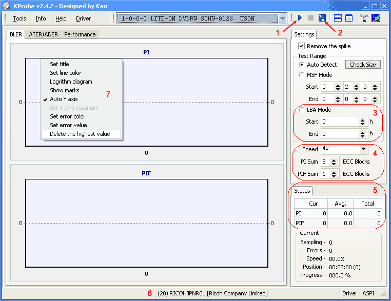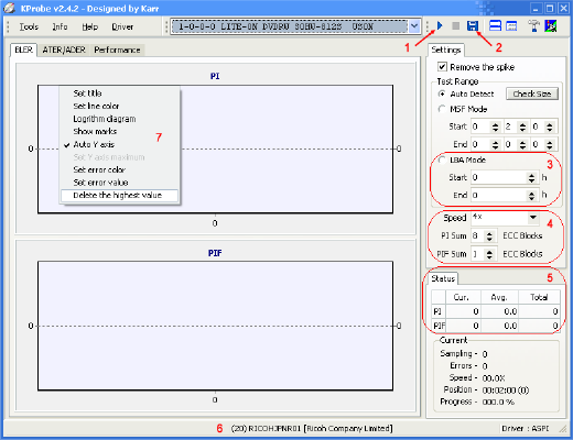 С настройками как на моем скриншоте можно запустить сканирование записанного носителя и получить уровень PI и PIF ошибок. Обратите внимание на пункт 4. на скриншоте и не меняйте настройки, если хотите, чтобы ваше сканирование имело смысл. Скорость не случайно выставлена в 4х - на этой скорости LITEON приводы применяют CLV, что обеспечивает прочтение всех секторов носителя на одинаковой скорости. Если вам лень ждать 15 минут, то не тестируйте на PI/PIF вообще. Что же касается PI sum и PIF sum, то эти настройки тоже лучше выставить как на скриншоте, чтобы обеспечить соответствие скана стандартам.