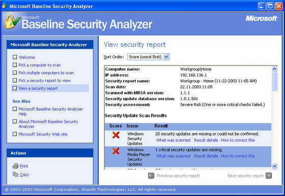 Недостатком данного сканера является то, что он не указывает, какие конкретно обновления (патчи) вам нужны, а рекомендует обратиться к странице Windows Update, что далеко не всегда удобно. Особенно в том случае, если вы уже вытягивали патчи из Интернета.