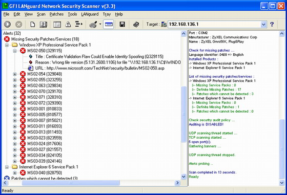 Этот сканер предназначен для поиска уязвимостей в компьютерных сетях не только на базе Windows. Однако, в нашем случае, можно легко воспользоваться ним для поиска уязвимостей на отдельном компьютере. В отличие от Microsoft Base Security Analyzer, будет рекомендовано посетить конкретные страницы бюллетеня безопасности от Microsoft (рис. 2)