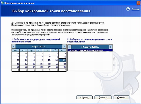 Теперь настало время проверить, как система восстановления справится с возникшей проблемой. Запустите программу восстановления еще раз. В открывшемся начальном диалоге (Рис. 13.1) установите переключатель расположенный в правой части в положение Восстановить мой компьютер в предыдущее состояние (Restore my computer to an earlier time) и нажмите кнопку Далее (Next). Появится диалог для выбора точки восстановления (Рис. 13.3). В этом диалоге вы сможете выбрать одну из точек восстановления, используя дату и описание, введенное вами при сохранении этой точки. Мы видим в диалоге календарь и список с описанием точек восстановления. На календаре будет установлена текущая дата. Все дни, в которых есть точки восстановления, будут отмечены на календаре жирным шрифтом. В списке, расположенном правее календаря отображаются описания точек восстановления, соответствующие выбранному дню.