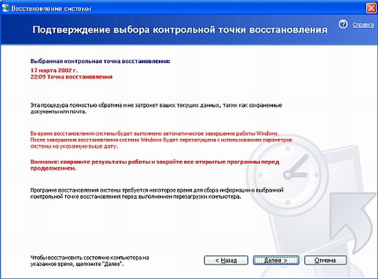 Как видно из рисунка, в списке присутствует созданная нами точка восстановления с именем Проверка системы восстановления. Восстановим состояние системы с ее помощью. Щелкните мышью на этом описании и нажмите кнопку Далее (Next), чтобы продолжить восстановление. Если восстановление затрагивает конфигурацию системы, то появится диалог с предупреждением. Нажмите кнопку ОК, чтобы закрыть этот диалог, если он появился. Теперь появится диалог для подтверждения выбора точки восстановления (Рис. 13.3).
