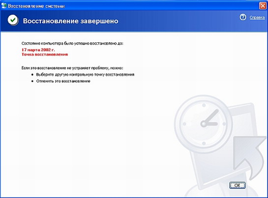 Система восстановлена по состоянию когда была создана выбранная вами точка восстановления. Отметим что если восстановление не решило ваши проблемы, то следует отменить его или попробовать восстановиться с другой точки. Нажмите кнопку ОК, чтобы закрыть этот диалог. Теперь можно продолжить обычную работу за компьютером.